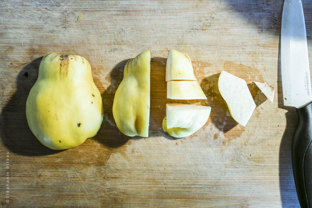 Vous verrez qu’ainsi, la préparation du coing avant sa cuisson va devenir un jeu d’enfant (enfin un jeu d’enfant avec un couteau dans les mains donc faites attention tout d’même).