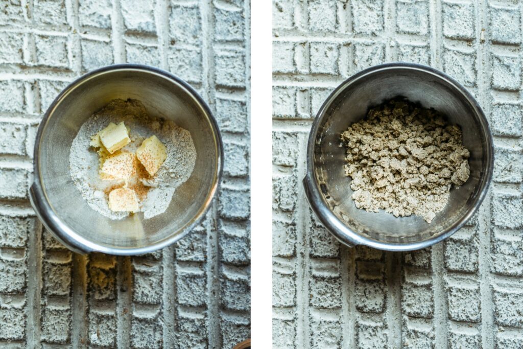 Pendant la cuisson des coings, on ne perd pas de temps ! Placer les 2 farines, le sucre et le beurre dans un saladier. Malaxer à la main jusqu’à avoir un sable homogène.
