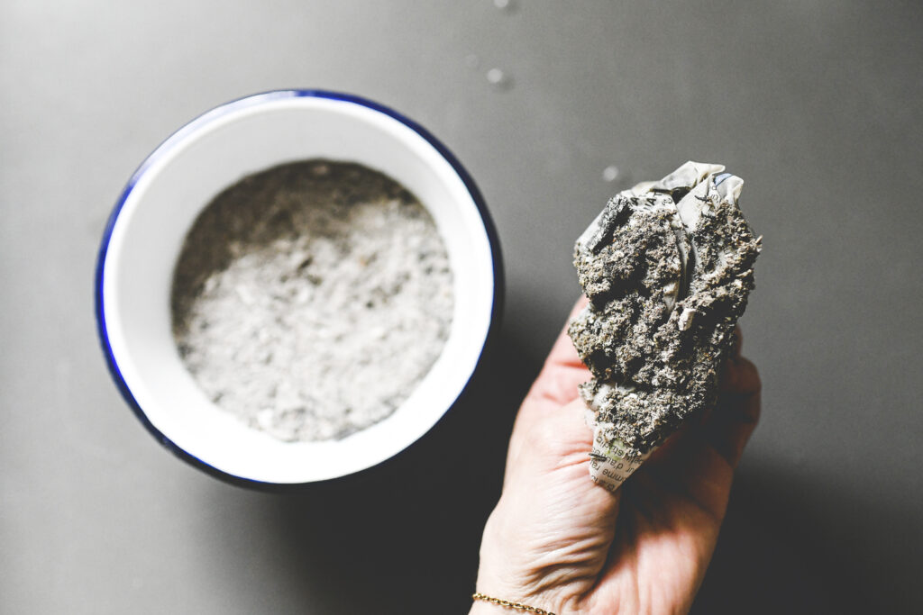 A gauche : petit pot de cendre / à droite une boule de papier journal